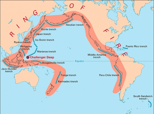 '불의 고리(Ring of Fire)'라고 불리는 환태평양 지진대가 10월들어 연달아 지진이 발생하는 등 심상찮은 조짐을 보이고 있다.필리핀 세부 북북동쪽 해역에서 지난 1일 규모 6.9의 지진이 발생한 것을 시작으로, 러시아 캄차카 해역(6.1)과 파푸아뉴기니 북부 해안(6.6)에서도 규모 6에 달하는 지진이 연달아 관측됐다. 8일에는 일본 가고시마현 남남서쪽 해역에서 규모 5.2의 지진이 발생