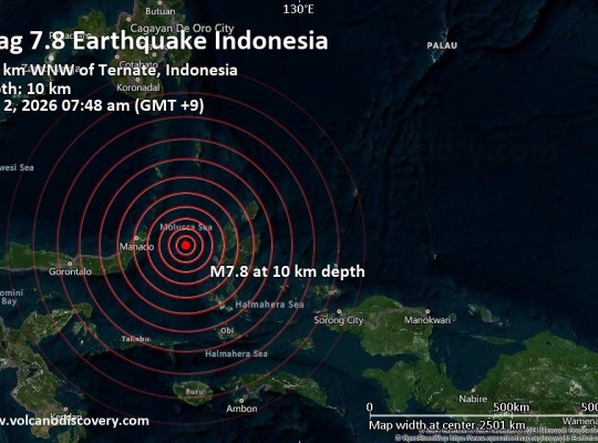 인도네시아 북몰루카 해역에서 규모 7.4의 강진이 발생해 한때 쓰나미 경보까지 내려졌다.2일 오전 6시 48분(현지시간) 인도네시아 북몰루카 해역에서 발생한 이번 지진은 미국 지질조사국(USGS) 기준 규모 7.4로 집계됐다. 당초 7.8로 발표됐으나 이후 하향 조정됐다. 진원의 깊이는 약 10~35㎞ 수준으로 비교적 얕다. 진앙은 북몰루카주 테르나테에서 서북서 방향 약 127㎞ 해상으로 분