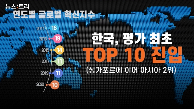 글로벌 혁신지수란 세계지식재산기구(WIPO)가 유럽경영대학원 인시아드(INSEAD), 미국 코넬대와 세계 130여개국의 경제혁신역량을 측정하여 2007년부터 매년 발표한 지수다. 올해는 지난해에 이어 스위스가 1위, 스웨덴, 미국, 영국, 네덜란드 등이 그 뒤를 이었으며, 아시아에서는 싱가포르가 8위, 중국과 일본은 각각 14위, 16위를 차지했다.