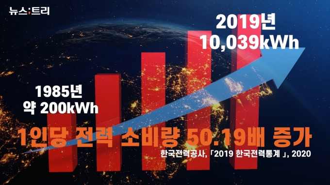 1985년 1세대당 보유 가전기기는 3.29대. 30여년이 지난 지금 세대당 가전기기는 스마트폰, 노트북PC, 에어프라이어 등 신 가전기기를 합쳐 17.34대에 이른다. 우리 일상에 전자기기의 비중이 더 높아졌다는 의미다. 전자기기가 다양해진 만큼 전력수요 역시 급격히 늘어났다. 1985년 약 200kWh였던 1인당 전력소비량이 2019년 1만39kWh로 약 50배 이상 증가했다.