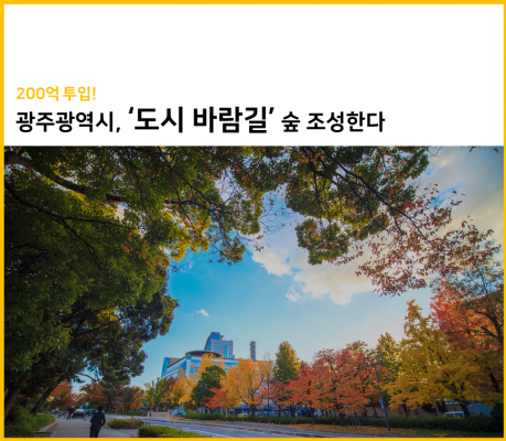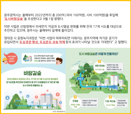 광주광역시는 올해부터 2022년까지 총 200억 (국비 100억원, 시비 100억원)을 투입해 ‘도시바람길숲‘ 을 조성한다고 9월 1일 밝혔다.