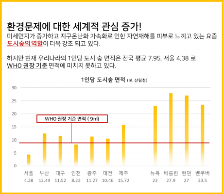 미세먼지가 증가하고 지구온난화 가속화로 인한 자연재해를 피부로 느끼고 있는 요즘 도시숲의 역할이 더욱 강조 되고 있다. 하지만 현재 우리나라의 1인당 도시 숲 면적은 전국 평균 7.95, 서울 4.38 로 WHO 권장 기준 면적에 미치지 못하고 있다.