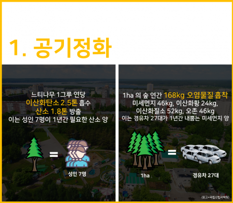 느티나무 1그루 연당 이산화탄소 2.5톤 흡수, 산소 1.8톤 방출 이는 성인 7명이 1년간 필요한 산소 양이다. 또한 1ha 의 숲 연간 168kg 오염물질 흡착하고 미세먼지 46kg, 이산화황 24kg, 이산화질소 52kg, 오존 46kg 이는 경유차 27대가 1년간 내뿜는 미세먼지 양이다.