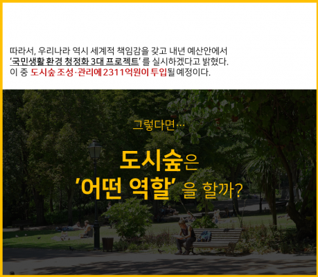 따라서, 우리나라 역시 세계적 책임감을 갖고 내년 예산안에서 ‘국민생활 환경 청정화 3대 프로젝트’ 를 실시하겠다고 밝혔다. 이 중 도시숲 조성·관리에 2311억원이 투입될 예정이다.