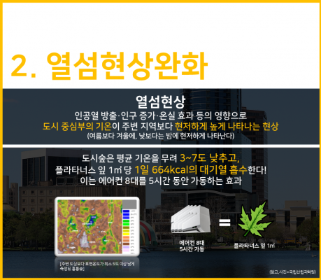 도시숲은 평균 기온을 무려 3~7도 낮추고, 플라타너스 잎 1㎡ 당 1일 664kcal의 대기열 흡수한다. 이는 에어컨 8대를 5시간 동안 가동하는 효과