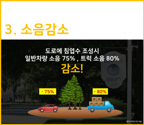 도로에 침엽수 조성시 일반차량 소음 75% , 트럭 소음 80%가 감소된다.