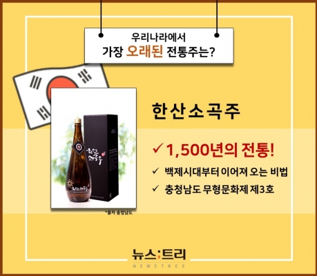 우리나라에서 가장 오래된 전통주는 '한산소곡주'. 이 술은 백제시대부터 이어져 내려온 비법으로 담그는 것으로, 1500여년의 전통을 지니고 있다. 충청남도 무형문화제 제3호로 지정돼 있다.
