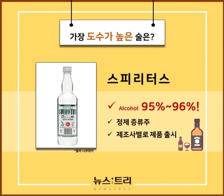 가장 도수가 높은 술은 '스피리터스'로, 알코올 도수가 95%~96%에 이른다. 정제 증류수에 해당되며, 제조사별로 브랜드가 다르게 출시되고 있다.