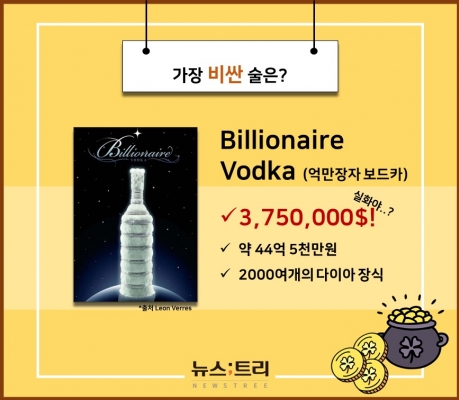 가장 비싼 술은 'Billionaire Vodka'. 일명 '억만장자 보드카'다. 가격은 3,750,000달러, 우리 돈으로 약 44억5000만원이다. 술 1병 가격이 서울의 노른자위 아파트 가격보다 훨씬 비싸다. 술값이 이렇게 비싼 이유는 장식품으로 사용된 2000여개의 다이아몬드 때문이 아닐까.