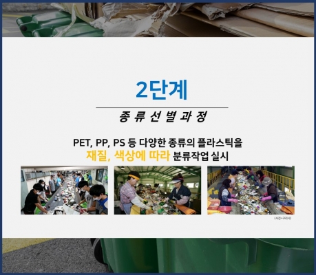 PET, PP, PS 등 다양한 종류의 플라스틱을 재질, 색상에 따라 분류작업 실시