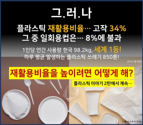 우리나라의 1인당 연간 플라스틱 사용량은 98.2kg로 하루 평균 발생하는 플라스틱 쓰레기는 약 850톤이나 된다. 그러나 우리나라의 플라스틱 재활용 비율은 고작 34%이다. 그 중 일회용컵은 8%에 불과하다.