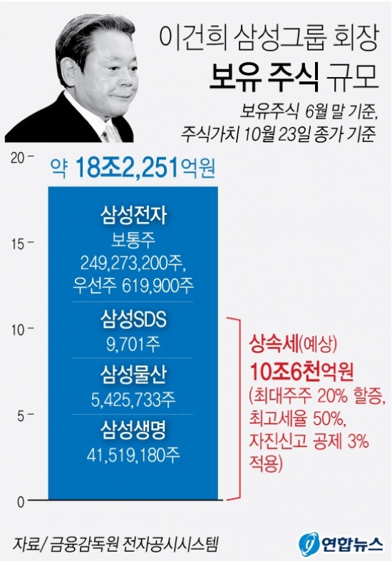 이건희 삼성그룹 회장이 지난 25일 별세하면서 그가 남긴 보유주식과 부동산 등을 둘러싼 상속세가 초미의 관심사로 대두되고 있다. 현재 추정에 의하면 이건희 회장이 보유한 주식의 가치가 약 18조원에 이르므로, 이에 대한 상속세만 10조원이 넘을 것으로 추정하고 있다.