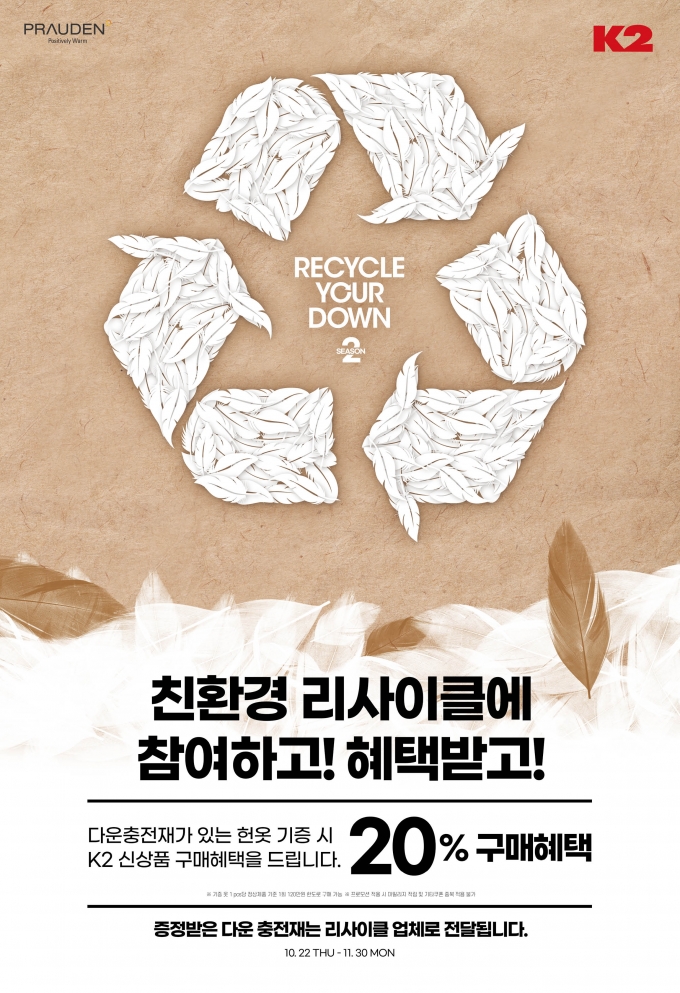 아웃도어 브랜드 K2는 안입는 거위·오리털 의류를 가져오면 새 제품 구매시 할인 혜택을 주고, 수거한 옷은 재활용하는 '리사이클 유어 다운 캠페인'을 오는 11월말까지 실시한다고 26일 밝혔다.