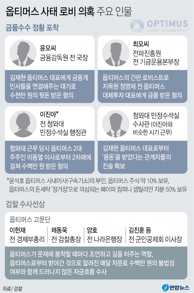 당시 옵티머스는 '적기시정조치'에서 벗어나기 위해 엄청난 로비활동을 했다는 정황이 '펀드 하자 치유' 문건과 자문단 녹취록 등이 속속 공개되면서 만천하에 드러났다. 옵티머스는 이헌재 전 경제부총리, 채동욱 전 검찰총장, 양호 나라은행 전 총장, 김진훈 전 군인공제회장 등을 자문단으로 뒀다.