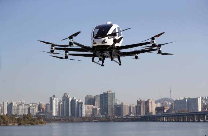 국토교통부와 서울시는 11일 오전 서울 하늘에서 사람이 탈 수 있는 드론택시 실험비행을 진행했다. 사람이 탈 수 있는 드론택시 기체가 실제 하늘을 비행하는 것은 국내 최초다.