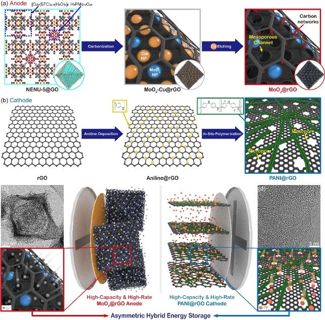 반면 하이브리드 전지는 배터리용 음극의 높은 저장 용량과 축전기용 양극의 빠른 이온 충·방전의 장점이 있어, 차량용 리튬이온 배터리를 대체할 차세대 에너지 저장소자로 주목받고 있다. 다만, 고에너지·고출력을 위해 음극과 양극 각각의 이온 저장 특성과 용량 등을 개선해야 한다. ▲KAIST 연구팀이 개발한 하이브리드 전지 저장 메커니즘 모식도 연구팀은 다공성 구조의 전도성 탄소 구조체를 기반으로 고용량 음극재와 양극재를 만들어, 고에너지·고출력 하이브리드 리튬이온 전지를 개발했다.