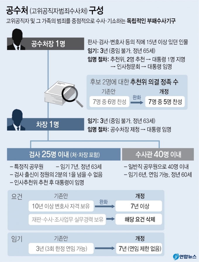 야당을 배제한 채 여당 추천만으로 공수처장을 추천할 수 있는 '고위공직자범죄수사처법'(공수처법) 개정안이 10일 국회 본회의를 통과함에 따라, 공수처법이 국회 본회의를 통과한지 1년만에 공수처 조직이 출범할 전망이다.