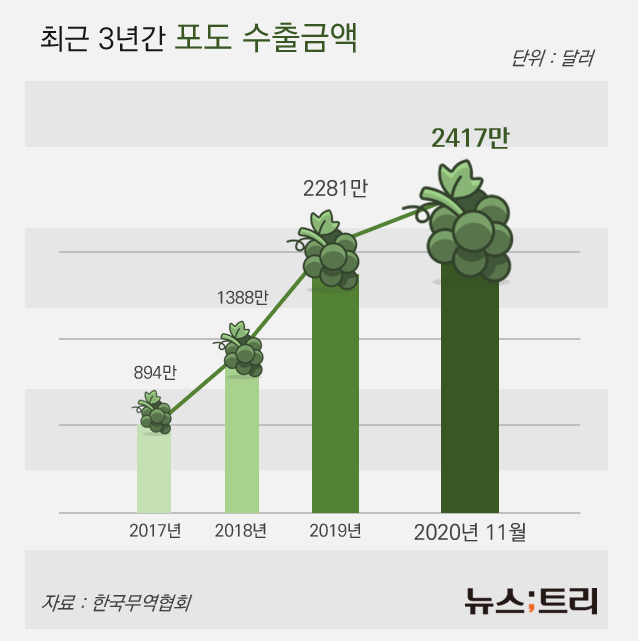 21일 한국무역협회에 따르면 최근 3년 사이에 포도 수출금액이 급증했다. 2017년 849만달러에서 2018년 1388만달러로, 2019년에는 2281만달러로 늘었다. 올해는 11월까지 2417만달러로 이미 지난해 수준을 넘었다.