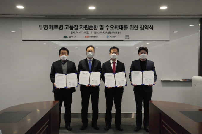 ▲(왼쪽부터)이상일 티메이케미칼 사장, 강태선 비와이엔블랙야크 회장, 박겸수 강북구청장, 탁용기 두산이엔티 대표가 협약을 체결했다. 우리나라의 페트병 분리 배출률은 80%에 이르지만 재활용되는 비중은 절반 수준에 불과하다. 페트병에 붙어있는 라벨과 이물질이 문제다. 특히 의류용 섬유를 만들기 위해서는 고순도 원료가 필요하다. 하지만 국내에서 이 기준을 만족하는 페트병을 구하기 힘들다. 이에 일본이나 대만 등 해외에서 페트병을 전량 수입해왔다.