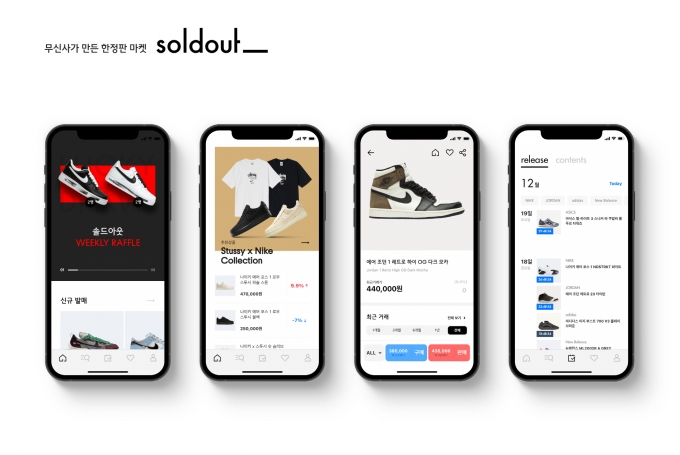 '무신사'가 운영하는 '솔드아웃'은 즉시판매와 입찰 등 두가지로 거래할 수 있다. 즉시판매는 판매가격을 판매자가 결정하고, 그 가격에 구매하는 방식이다. 입찰은 판매자의 제안가와 구매자의 입찰가가 일치하면 자동으로 거래가 성사된다. 솔드아웃은 판매자로부터 제품을 받아 정품여부를 검수한 다음 구매자에게 배송하기 때문에 '안심거래'가 가능하다. 이런 방식 덕분에 '솔드아웃'은 론칭 반년도 안된 지난 11월 기준 누적 다운로드수가 25만회를 넘었다.