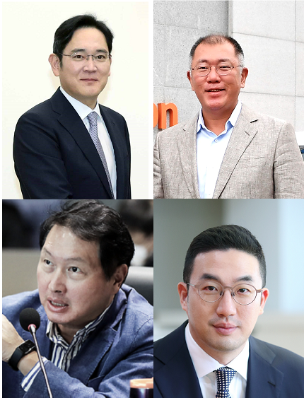 ▲4대그룹 총수.(좌측 상단부터 시계방향으로 이재용 삼성전자 부회장, 정의선 현대차그룹 회장, 구광모 LG 회장, 최태원 SK 회장) ◇ 이재용·이선호·이규호…총수 일가 변화는?