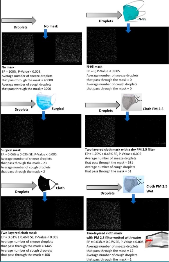 뉴멕시코주립대학 크리쉬나 코타 부교수 등이 참여한 연구팀은 마스크 5종에 대해 비말차단 실험을 실시한 결과, 마스크가 침방울이 멀리 튀지 못하도록 차단하는 효과는 있지만 공기중으로 침 입자가 새는 것까지 막지는 못하는 것으로 확인됐다. 일부 소재는 1.8m 거리에서 코로나19 감염을 유발할 수 있을 정도의 비말이 빠져나갔다.