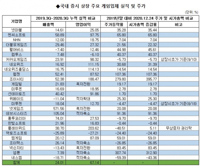 28일 국내 상장된 게임업체 중 3분기 누적 매출액 100억원 이상인 27개사를 대상으로 실적을 집계한 결과, 해당업체들의 전체 매출액은 전년보다 24.01% 증가했다. 영업이익은 67.14%나 늘었다. 실적이 좋다보니 8개업체만 제외하고 나머지 기업들은 지난해 종가보다 대부분 주가가 올랐다. 주가가 하락한 플레이위드의 경우는 무상증자 권리락에 따른 것이어서 실제로 주가가 하락한 기업은 8개라고 할 수 있다.(올해 상장한 카카오게임즈, 미투젠은 시초가 기준)