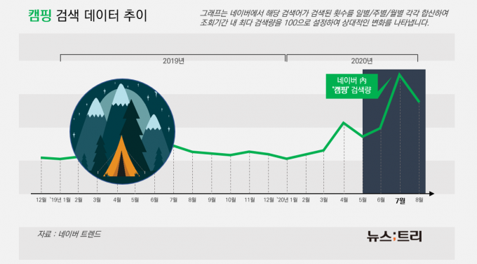 이같은 결과는 검색데이터에서도 그대로 드러났다. '캠핑'이 구글 트렌드의 올해의 검색어로 선정되는가 하면, 네이버 데이터 분석결과 2020년 캠핑의 검색량은 전년대비 폭발적으로 증가했다.