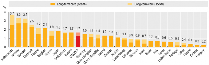 실제로 우리나라 장기요양보험 비용은 2020년 기준 국내총생산(GDP) 대비 0.6%에 머물렀다. 경제협력개발기구(OECD) 회원국의 평균인 1.7%를 한참 밑돈다. 대표적인 고령국가인 일본은 GDP의 1.8%를 장기요양보험 비용으로 지출하고 있다.