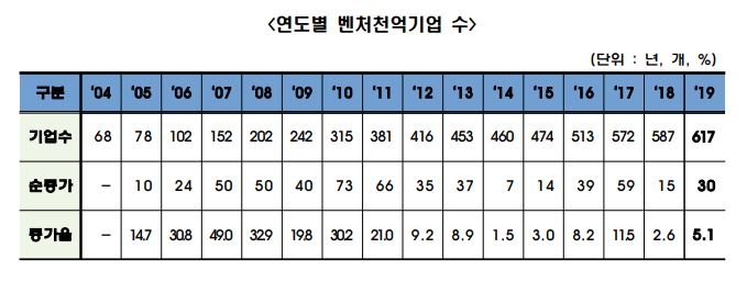 국내 '벤처천억기업' 617개가 지난해 총 매출액 140조원의 25% 달하는 30조원을 해외에서 벌어들였다. 이는 우리나라 전체 수출의 5.0%, 대기업 총수출의 7.8%에 해당하는 규모다.