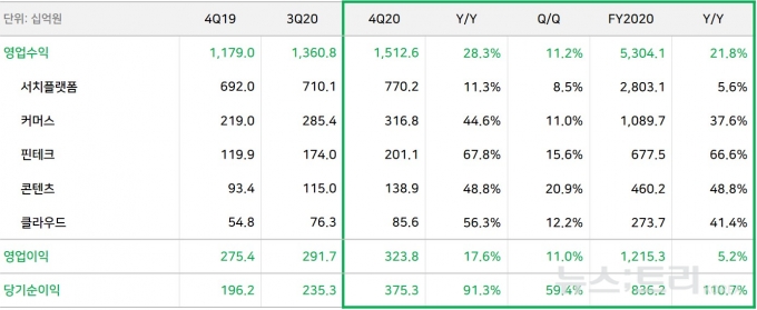 핀테크는 스마트스토어와 네이버페이의 성장에 힘입어 전분기 대비 15.6% 성장한 2011억원을 기록했다. 핀테크 부문의 연간 수익은 전년 대비 66.6% 성장한 6775억원을 기록했다.