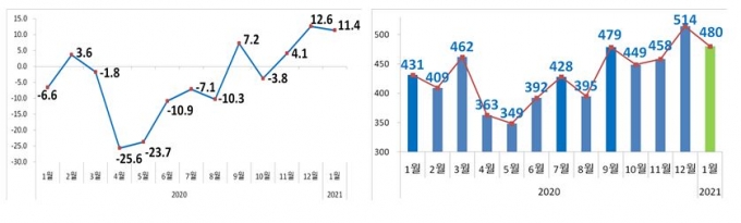 1일 산업통상자원부가 공개한 '1월 수출실적'에 따르면 전세계 코로나19 팬데믹 상황에도 불구하고 우리나라 수출액은 전년동기대비 11.4% 늘어난 480억1000만달러를 기록하며 산뜻하게 2021년을 출발했다. 1월 수입은 3.1% 늘어난 440억5000만달러였지만 수출이 대폭 늘면서 39억6000만달러의 무역흑자를 냈다. 9개월 연속 흑자행진이다.