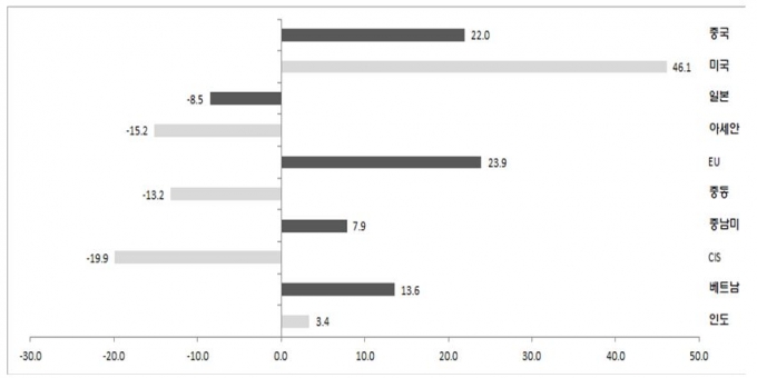 반면 아세안 지역 수출은 감소했다. 지난달 수출이 늘었던 일본은 8.5% 줄었다. 중동은 13.2% 감소하면서 10개월 연속 감소세를 보였다.
