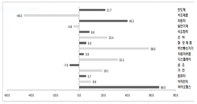 주력 수출 15대 품목 중 반도체, 자동차 등 12대 품목의 수출이 증가했다. 12대 품목은 반도체(21.7%), 자동차(40.2%), 철강(6.0%), 석유화학(8.6%), 선박(23.4%), 디스플레이(32.2%), 차부품(3.9%), 무선통신기기(58.0%), 컴퓨터(5.7%), 이차전지(9.9%), 바이오헬스(66.5%), 가전(19.1%) 등이다. 주력 수출 10대 품목이 3개월 연속 증가한 것은 40개월만에 처음이다.