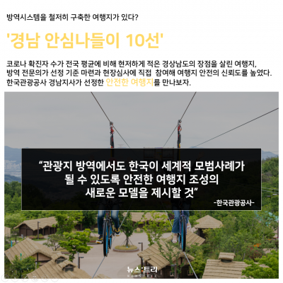 경남지역은 인구대비 코로나 확진자 수가 전국 평균에 비해 현저히 낮은 편이다. 이번에 선정된 '안심 나들이 10곳'은 방역 전문의가 정한 기준에 맞춰 선정한 것으로, 여행지 안전의 신뢰를 높이기 위해 전문가들이 현장 심사에 직접 참여했다.