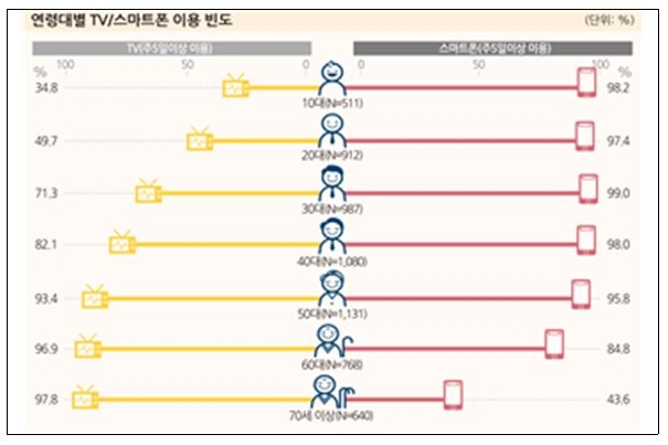 이처럼 고령층의 스마트폰 보유율이 확대되면서 스마트폰은 개인화된 미디어로서 영향력이 점점 커지고 있다. 스마트폰 이용빈도는 10대가 98.2%로 절대적이며, 70대 이상에서도 43.6%로 나타났다. 반면 TV 이용빈도는 70대가 97.8%이고 10대는 34.8%로 대비됐다.