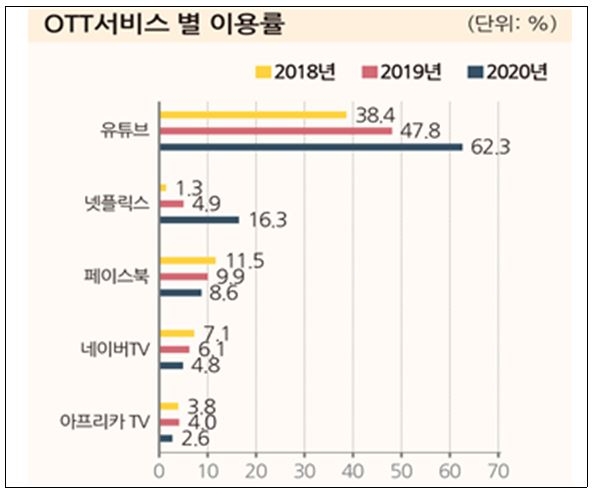 가장 많이 이용하는 OTT 채널은 유튜브로, 62.3%에 달했다. 이는 전년의 47.8%에서 14.5%포인트 늘어난 것이다. 이용률이 급격하게 늘어난 OTT 채널은 넷플릭스다. 넷플릭스는 2019년까지만 해도 이용률이 4.9%에 머물렀지만 지난 한해동안 16.3%로 껑충 뛰었다. 1년새 3배 이상 폭증했다. 토종 OTT인 네이버TV 이용률이 1년 사이에 6.1%에서 4.8%로 감소한 것과 대조적이다. 페이스북 이용률도 9.9%에서 8.6%로 소폭 줄었다.