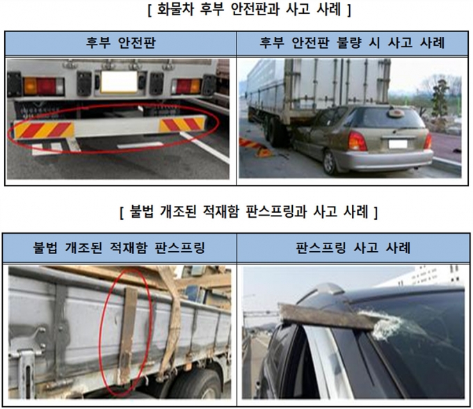 후부 안전판은 후미 추돌 시 차고가 높은 화물차의 적재함이 승용차의 일부를 밀고 들어가 상해를 가중시키는 것을 방지하는 장비다. 하지만 후부 안전판을 기준(550mm)보다 높은 위치에 설치하는 경우 후방에서 추돌한 승용차량의 차체 일부가 화물차 하부로 들어가는 언더라이드 현상이 발생해 심각한 안전사고를 초래할 수 있다.