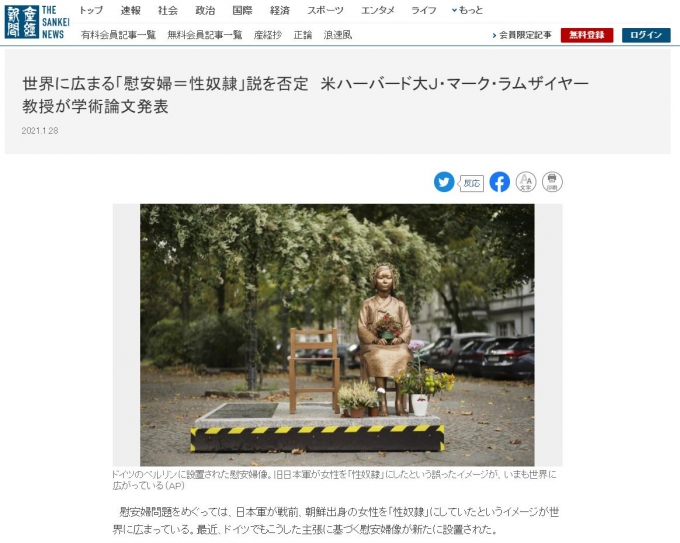 [세계로 확산 "위안부 = 성 노예" 설을 부정하는 미국 하버드대 램지어 교수 학술 논문 발표]