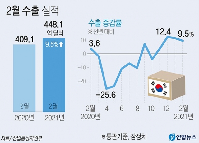 1일 산업통상자원부가 발표한 '2월 수출실적'에 따르면 2월 수출은 지난해 같은기간보다 9.5% 증가한 448억1000만달러를 기록했다. 이는 지난 2012년 2월 기록한 463억2000만달러 이후 9년만에 최고실적이다.