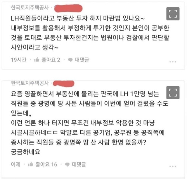 이 직원은 "내부 정보를 활용해 부정하게 투기한 것인지, 본인이 공부한 것을 토대로 부동산 투자한 건지는 법원이나 검찰에서 판단할 사안"이라고 썼다. 또다른 직원은 "1만명 넘는 LH 직원 중 광명에 땅 사둔 사람들이 이번에 얻어걸렸을 수도 있다"며 "하나 터지면 무조건 내부정보 악용한 것마냥 시끌시끌하다"고 했다. 그러면서 "막말로 다른 공기업·공무원 등 공직에 종사하는 직원 중 광명쪽 땅 산 사람 한 명 없을까"라고 반문했다.