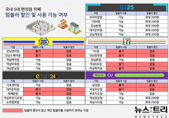 5대 편의점 가운데 세븐일레븐과 미니스톱, 이마트24는 아예 텀블러 할인을 하지 않았다. 텀블러를 가지고 가도 무조건 일회용 컵을 사용해야만 했다. 미니스톱 강남스퀘어점에서 텀블러 커피를 주문하자 직원은 "일회용 컵에 커피를 받아서 텀블러에 다시 넣는 방법이 있다"라며 일회용 컵을 내밀었다. 세븐일레븐 강남역TGI점 직원은 "크기가 안 맞아서 들어갈까 모르겠다"며 텀블러 사용을 꺼렸다.