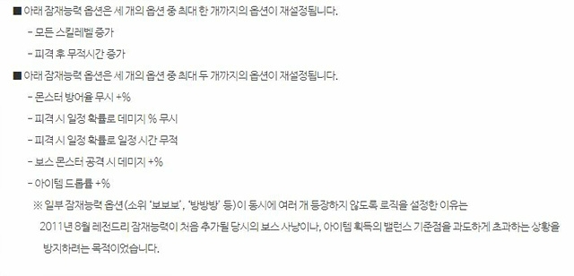 넥슨측은 "2011년 8월 레전드리 잠재능력이 처음 추가될 당시의 보스 사냥이나, 아이템 획득의 밸런스 기준점을 과도하게 초과하는 상황을 방지하려는 목적"이라고 설명했다. 즉, 너무 강한 아이템이 나오면 게임의 재미가 떨어지기 때문에 막았다는 뜻이다.