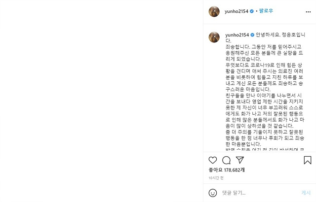 유노윤호는 10일 인스타그램에 "죄송합니다, 그동안 저를 믿어주시고 응원해주신 모든 분들께 큰 실망을 드리게 되었습니다"라며 "무엇보다도 코로나19로 인해 힘든 상황을 견디며 애써 주시는 의료진 여러분을 비롯하여 힘들고 지친 하루를 보내고 계신 모든 분들께도 죄송하고 송구스러운 마음입니다"라고 사과문을 게제했다.