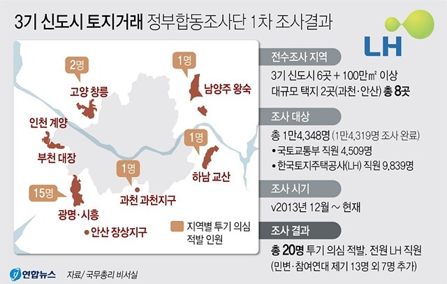 정부합동조사단은 국토부와 LH 전 직원(1만4348명) 중 제때 개인정보 이용동의서를 제출한 1만4319명을 대상으로 3기 신도시 6곳, 100만㎡ 이상 대규모 택지 2곳의 토지거래를 조사했다.