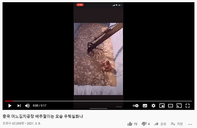 그는 이어 "김치용 배추는 냉장 상태에서 24시간 안에 절여야 한다"면서 "해당 영상을 보면 김치 제조 공정이 아님을 알 수 있다는 게 중국에 진출한 한국 김치 업체 관계자들의 설명"이라고 전했다.