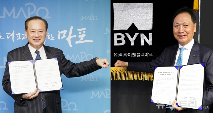 비와이엔블랙야크와 마포구는 지난 12일 투명 페트병 재활용 활성화 사업 확대를 위한 업무 협약을 체결했다고 14일 밝혔다. 이날 협약은 강태선 블랙야크 회장과 유동균 마포구청장이 언택트로 진행했다. ▲유동균 마포구청장(왼쪽)과 강태선 블랙야크 회장은 투명 페트병 재활용 활성화 사업확대를 위한 언택트 업무협약을 체결했다.(사진=비와이엔블랙야크) 블랙야크는 마포구에서 수거된 투명 페트병을 재활용한 'K-rPET(케이-알피이티) 재생섬유'로 의류 및 용품을 생산한다. 마포구는 이 친환경 제품을 우선 구매한다.