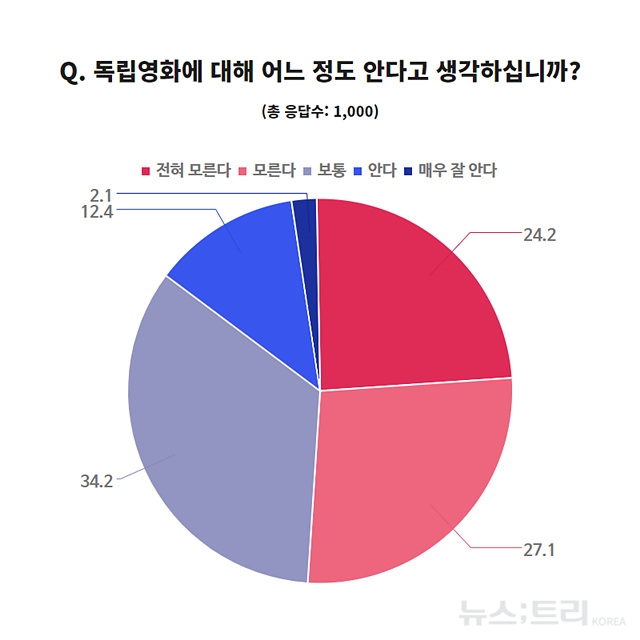 '보통'이라고 답한 응답자 34.2%까지 합하면 독립영화를 제대로 알지 못하는 사람이 85.5%에 이르는 것으로 조사됐다.