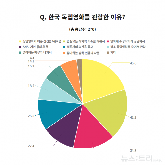 이외 '상업영화를 선호하기 때문'이라는 응답자는 31.2%, '독립영화를 찾아볼 필요성을 못느낀다'는 응답자도 27.1%으로 나타나, 국내에서는 독립영화보다 상업영화에 대한 선호도가 더 뚜렷한 것을 알 수 있다.