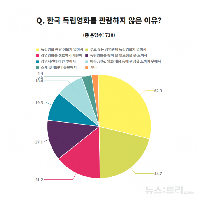 '한국 독립영화를 관람하지 않는 이유'에 대해 응답자의 62.3%가 '관람 정보가 없어서'라고 답했다. 또 44.7%는 '주로 찾는 상영관에 독립영화가 없어서'라고 답했고, 19.3%는 '상영시간대가 안맞아서'라고 응답했다. 그만큼 국내에서는 독립영화 생태계 자체가 조성되지 않았다는 것을 알 수 있다.
